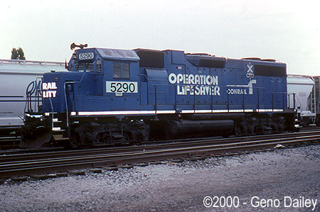 A former Conrail GP38-2 in "Operation Lifesaver" paint, renumbered as NS #5290. This unit is former Conrail #8102 and was photographed in Sandusky, OH near the Amtrak Station there on July 25th, 2000.