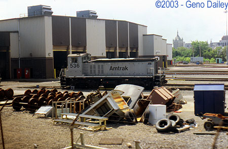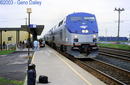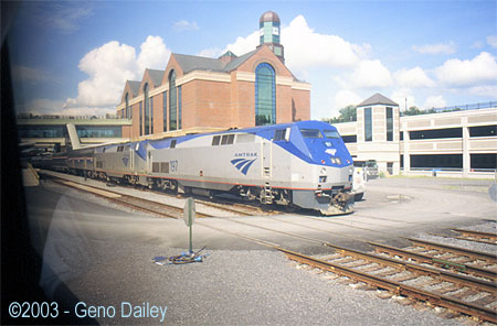![]() Amtrak Train #284 arriving into Depew with repainted P32AC-DM #702 for power. This train should otherwise be the second Eastbound train out of Depew but because our train was so late, this one was first. ![]() CSX Train Q-390 (Conrail Train NPSE) passes by Depew Station with Union Pacific SD70M #4041 shortly before our train (Amtrak Train #48) arrived. ![]() Shown here is the train that would take me to the Big Apple for the first time! Amtrak Train #48 with P42DC #197 on the lead, arriving into Buffalo-Depew Station at 7:30am. ![]() Yours truly writing my travelogue and taking a quick phone call, yes I guess I can be officially called a train traveler in the 21st Century! (OK, this picture was entirely staged but I think you get the point, ha ha!!) ![]() Looking at part of the Albany skyline, this photo was taken just before crossing the Hudson River Bridge into Rensselaer. ![]() The Hudson River, a body of water we would all become very familiar with as we traveled towards New York City as it would now parallel the train the rest of the way. ![]() Amtrak MP15 #536 sitting in the Rensselaer Yard & Shops along with a pile of wheels and some other junk as we passed by the shops prior to arriving in Rensselaer. ![]() P40DC #828, sitting in the Rensselaer Yard. These units have become commonplace here in the Northeast as regular power North and West of Albany on trains such as the Maple Leaf as well as the Adirondack. ![]() Here comes P32AC-DM #701 backing up and coupling up to the first New York Section Coach. You can photograph a lot through that small window on the door in the coach if you have a good lens! ![]() Looking out the window of my coach is now Train #448 that will be serviced and sent West as part of Train #49 since the Boston Section wasn't running today and was replaced by busses due to CSX Trackwork. ![]() One of the many huge bridges that span the mighty Hudson River on the way to New York. I had no idea the Hudson River was this big, of course I've never visited this area before so this was all new territory for me! ![]() A Metro-North P32AC-DM sitting on a refueling pad somewhere South of Poughkeepsie. |