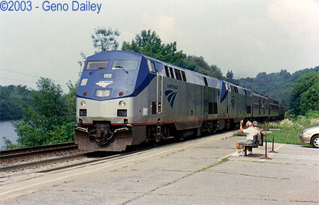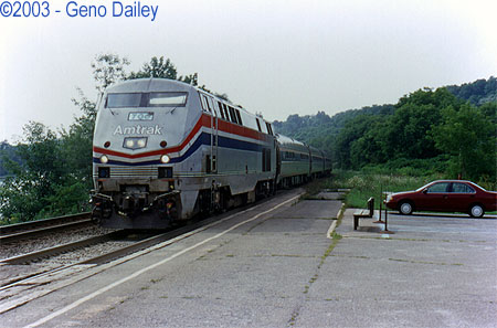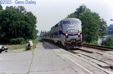 This ended up being a very hot, humid day. I figured that by late afternoon we would have gotten a nasty thunderstorm but it never actually rained. Around 2:45pm, an ice cream truck showed up at the station and I wasted no time in buying a Watermelon Flavored Italian Ice treat and a can of pop to cool off with since all I really had was 1 can of warm Diet Pepsi in my bag and the water fountain in the station! This was a welcome site as several passengers also bought some cold treats from the ice cream truck! Things started getting interesting as the day wore on. Train #283 was otherwise estimated to arrive in Amsterdam at 5:00pm on time but repeated calls to Julie at and after 5:00pm said the train was not yet in Albany but was still estimated to arrive on time? It turns out that tragedy struck about 24 miles East of Amsterdam in the Town of Colonie. Amtrak Train #286 struck and killed a man walking his dogs alongside the tracks. The train was traveling in the section of track that is rated for 100mph speeds. This tied up Amtrak Traffic in both directions for about 3 hours while the investigation took place. Amtrak Trains #283 and #49 were stuck in Albany waiting for the track to reopen. The caretaker at the station here in Amsterdam kept everyone informed of the situation as it made local news headlines that evening. Rich showed up at the station around 7:30pm to pick me up and told us that Trains #283 and #49 were lined up at CP-169 waiting for a freight to clear. At 8:12pm, running over 3 hours late, Train #283 arrived at Amsterdam with repainted P32AC-DM #704. Shortly after he departed, #49 blew through at 70mph now running over 2 hours late! Rich and I left the station and took a drive out to see some other trainwatching spots. We ended up driving as far as Verona, near the Turning Stone Casino which is just East of Syracuse before we stopped at a gas station, got some snacks and hopped on the Thruway and headed back to Schenectady. It was after dark and there wasn’t much freight traffic all evening. So ends Day #5... |