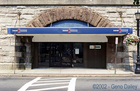 The Front Doors of Amtrak's Station in Springfield, MA. Note my reflection in the windows due simply to my lack of planning when I took this slide! The station is actually built into a huge stone wall that extends up more than 20 feet.