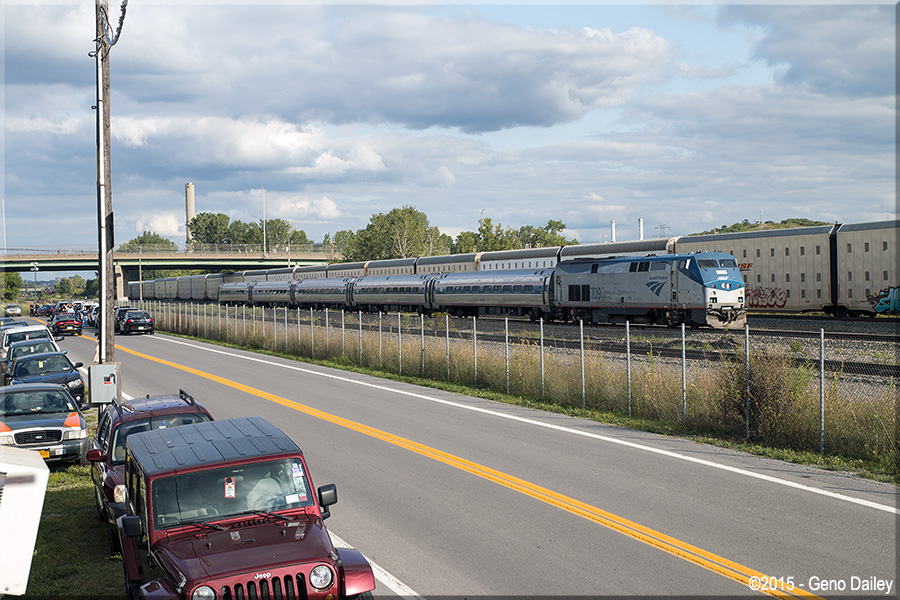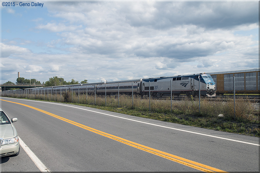 | Later on, Amtrak Train #63 - The Maple Leaf, this time, bound for Toronto, passes by the State Fair with GE P42DC #205 for power. |