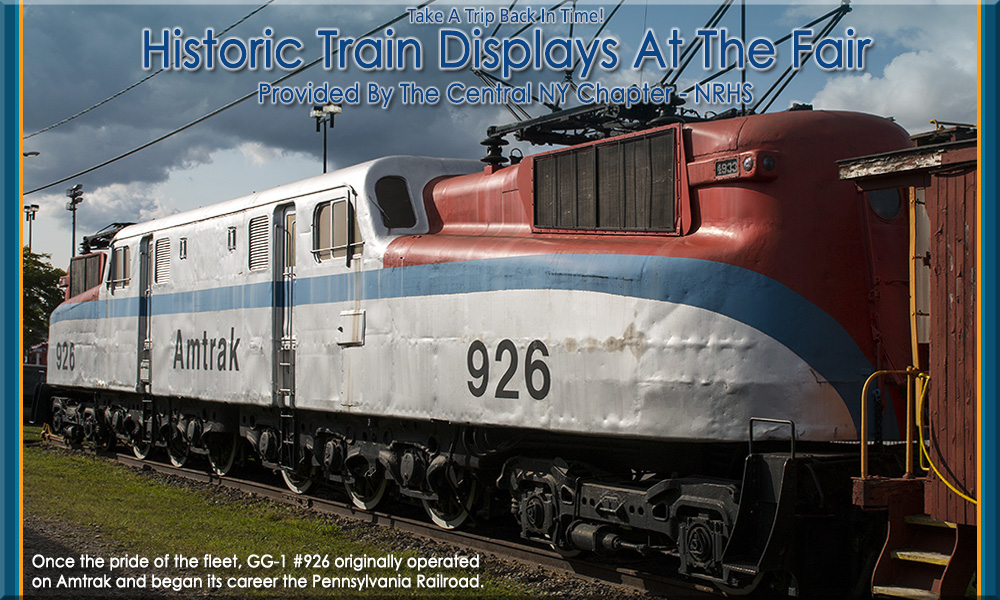 | On permanent display at the Great New York State Fair are pieces of historic railroad equipment owned by the Central New York Chapter of the National Railway Historical Society. Included here are some photos of these wonderful examples of railroading's past here in New York and the northeast. Special thanks goes to the Chapter for historical information used in this portion of the travelogue. |