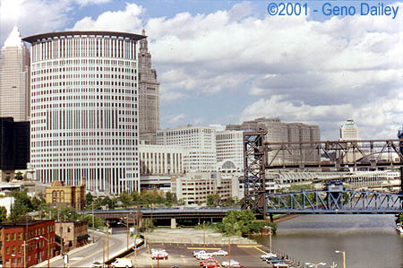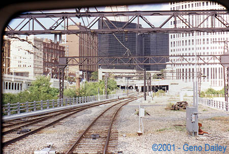 As you can see from these 4 slides, the view is amazing, shortly after I took the last slide above, which actually shows Tower City as those 2 black buildings in the center of the photo, the train would pull into Tower City, where I would spend some time having lunch and check out the FYE Music store and its authentic '57 Chevrolet on display! I picked up a couple more CD's before leaving Tower City and heading back to the Waterfront RTA Station near the Amtrak Station where my train back to Sandusky would arrive.