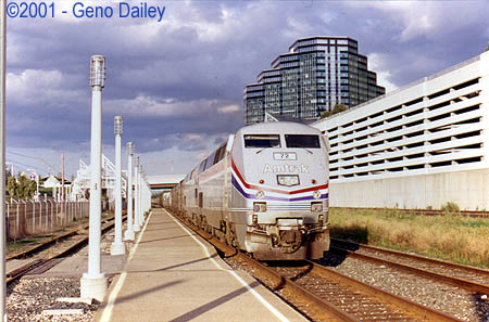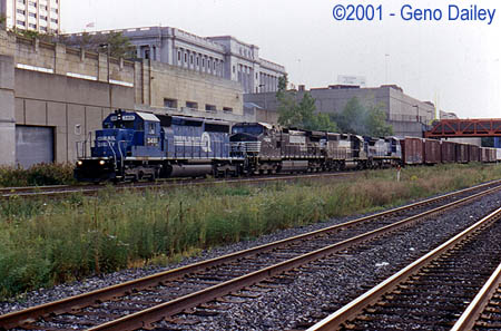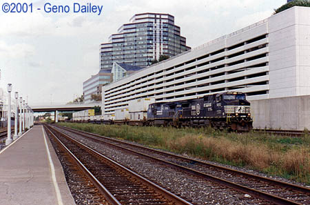 2006 Update! Once again, a "Deleted Scene" with this NS van train heading West past the station. Note the 2 tracks in front of the station platform. Today, only one track exists as CSX tore out the second track as it was no longer needed since this area is for the most part only used by Amtrak. Incredibly for a short distance, the Water Level Route is SINGLE TRACK!!!
