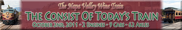 After the tour ended, I headed to my seat in the dome car and other passengers were now filing in as well. We departed Napa at 11:30am bound for St. Helena where the train's 2 locomotives would be run around so as to pull us back to Napa. The consist for today's train is shown below: |