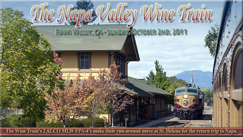 As part of what's included with my ticket today, I was served a glass of Mumm Napa Brut Prestige Sparkling Wine. Shortly thereafter, the servers came around and took everyone's order for the food all at once and would serve each course separately throughout the ride. The train would be travelling at a speed of 18mph powered by two ALCO MLW (Montreal Locomotive Works) FPA-4's, one of which as been converted to run on Compressed Natural Gas! The electric power in the train is supplied via Head End Power (just like on Amtrak). The menu does suggest a different wine to go with each course of the meal and all of the wines suggested are available on the train for a separate charge. The Appetizer was served first. I selected the Flourless Yam Ravioli stuffed with House Smoked Goat Cheese and topped with Grape Relish. I had never eaten a yam ravioli or goat cheese before and this was quite tasty! I took several pictures of the passing scenery as well as chatted with a few passengers from Japan who were seated across from me throughout the ride. The First Course was next: I selected the Red and Green Apple Endive Salad with Gorgonzola Cheese, Hazelnuts and Mustard Vinaigrette dressing. This salad was delicious! I never thought of hazelnuts being used in a salad before! Next up was the Main Course: I had the Grilled and Roasted Beef Tenderloin with a Potato Sauté topped with a Roasted Mozzarella Artichoke Heart. The beef tenderloin was cooked and seasoned perfectly and overall everything was delicious! I would have one other glass of wine outside of the one that came with my ticket. I chose the Hagafen Riesling since Riesling is one of my favorite wines. It cost an extra $12.00 but it was worth it, it was a great wine! Throughout the ride, the servers would point out different wineries along the way. A couple that I remember hearing about were Sutter Home and an affiliate of Kendall-Jackson whose wines are very much available back home in New York! I told a few people on the train that where I'm from in New York might as well be the "Napa Valley of the East" because the wine industry back home is huge! Take a short drive outside of Buffalo along the New York State Thruway and you'll pass vineyards everywhere! Like in Napa Valley, there are certain grapes that grow best in the soil conditions in Western & Central New York which makes the wine industry so big back home!