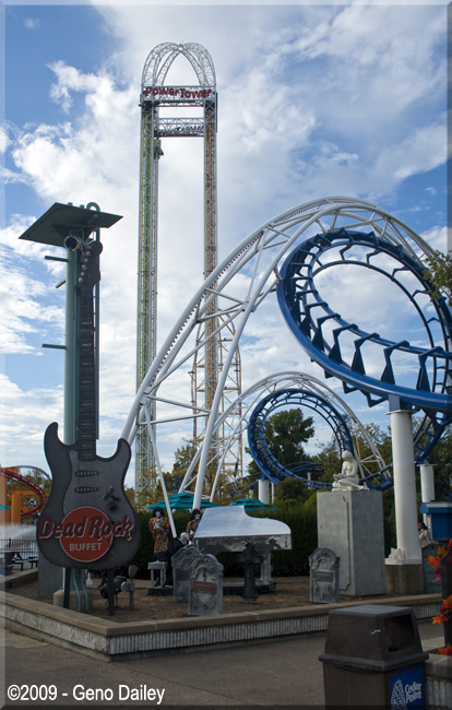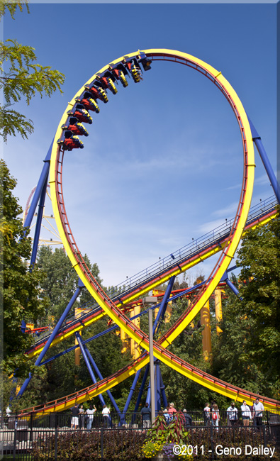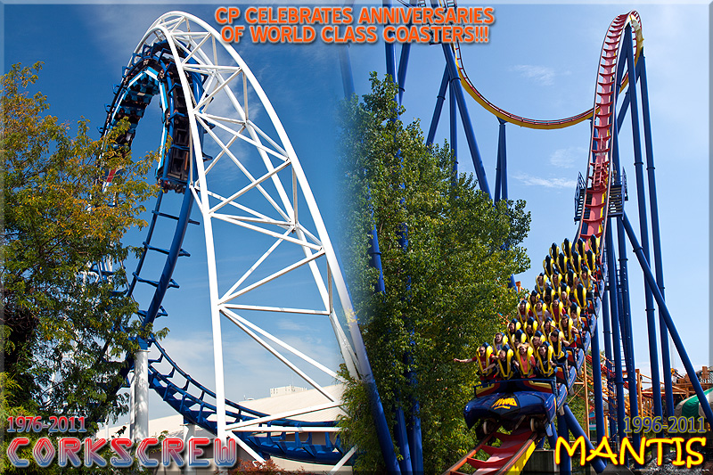 | Mantis opened in 1996 with a design that has you standing up through the entire duration of the ride! Featuring a 145 foot tall first hill, this coaster has 4 inversions and reaches top speeds of 60mph! It is still one of the tallest and fastest coasters of its kind in the world and like Corkscrew, is just plain fun to ride! Included here are photos taken of the big bug this year! Enjoy... |
