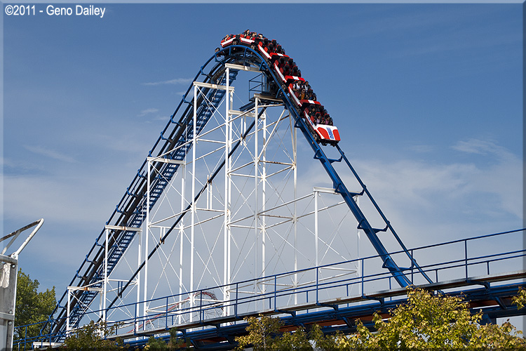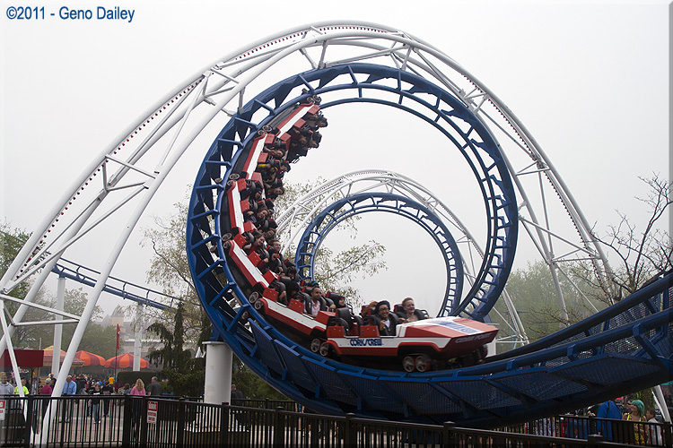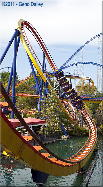 | LEFT: Mantis heading into one of its 4 inversions. RIGHT: Coming down a steep drop! |