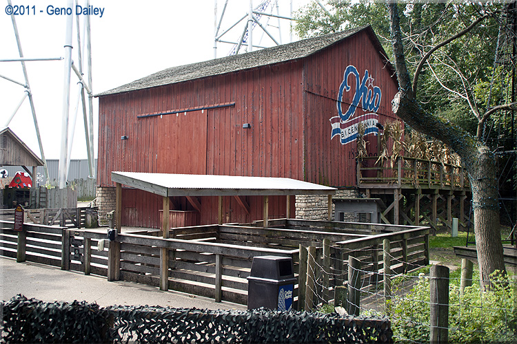 | A red barn featuring the Ohio Bicentennial symbol. |