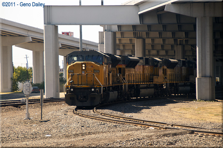 Crossing in front of some stopped Union Pacific power at Tower 55 in Fort Worth, TX.