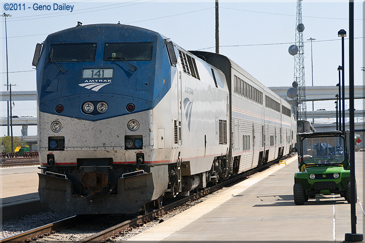 | Amtrak Train #822 - The Heartland Flyer with P42DC #141, waiting at Fort Worth for departure later today. |