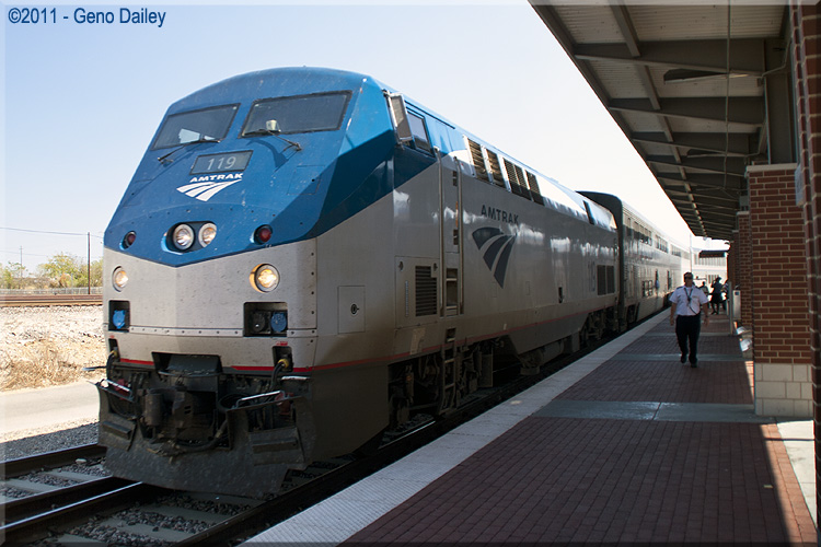 | Amtrak Train #22 - The Texas Eagle northbound at Fort Worth station with P42DC #119 on the lead. |