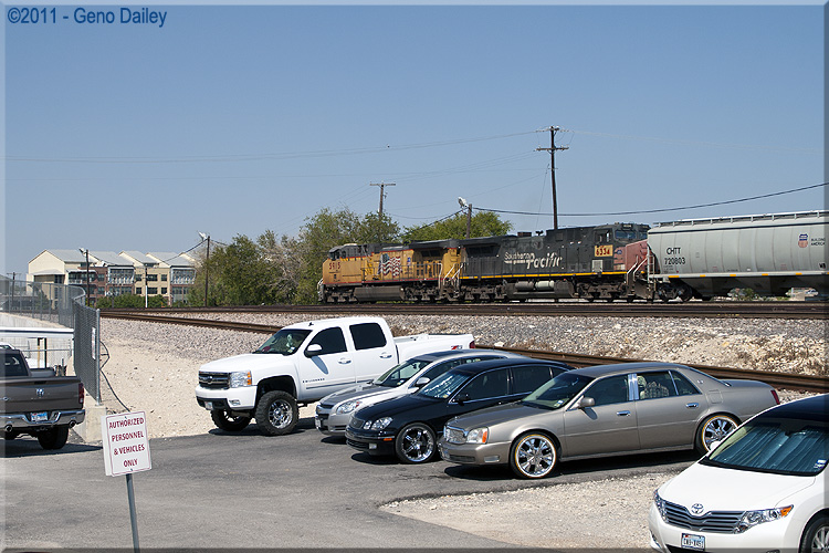 | A Union Pacific freight passing by the station facilities at Fort Worth along with a couple customized vehicles in the foreground! |