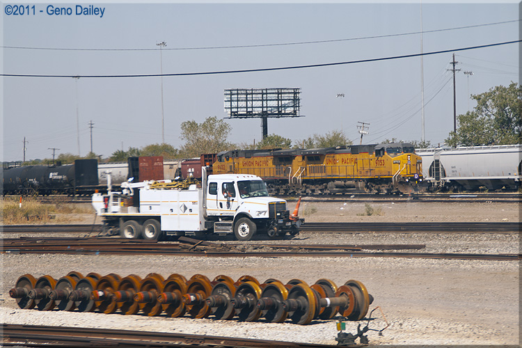 | Some UP power at the yard in Fort Worth with a Hi-Rail truck and some new passenger car wheels!!! |
