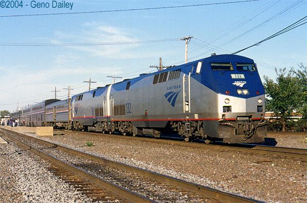 ![]() From Galesburg, IL taking a breather, Amtrak's California Zephyr lead by P42DC #132 finishes up it's station work before heading West on September 27th, 2004 |
