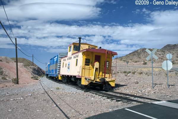 | The NVSR's caboose. The train is going over Railroad Pass in this photo. |