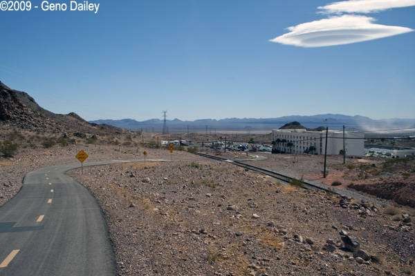 Looking east with the Railroad Pass Hotel in the background. Note the cloud in the upper-right corner