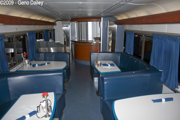 Amtrak's hopefully "experimental" Diner-Lounge interior. This car was being used as a regular