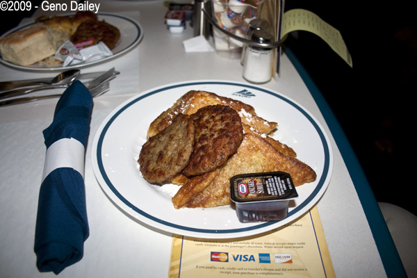 | Railroad French Toast and Sausage Patties, delicious breakfast in the dining car!!! |