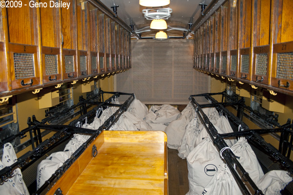 The inside of the Railway Post Office (RPO) on the train. There was actually a video playing on the screen
