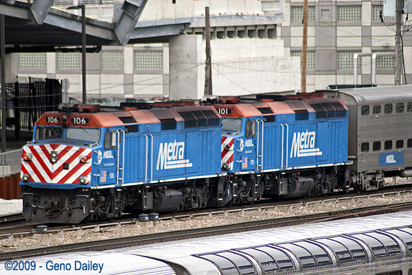 | Two Metra F40's on a commuter train leaving Union Station. |
