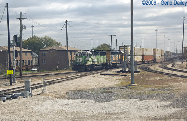 | Crossing near the BNSF (Former Santa Fe) Corwith Yard where a BNSF freight waits for us to clear the diamond. |