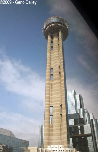 LEFT: The Dallas Reunion Tower as seen from my sleeping car window shortly before arriving in Dallas.