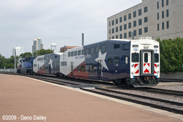 | A Trinity Rail Express commuter train arriving at Dallas. |