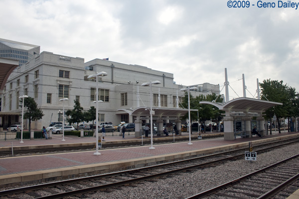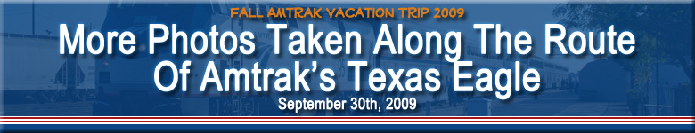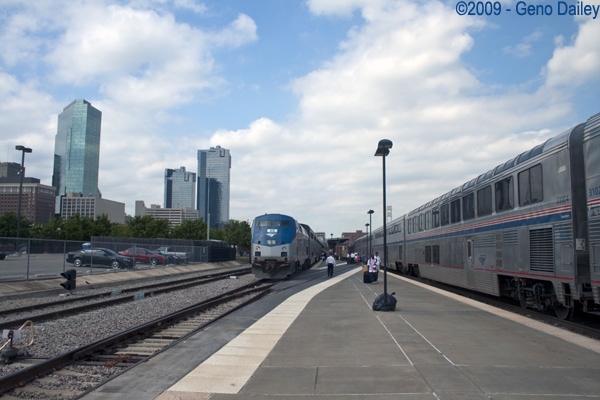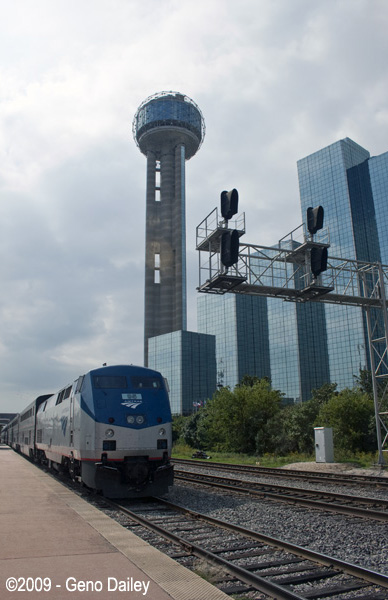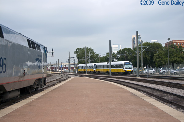 | The Texas Eagle with a DART (Dallas Area Rapid Transit) Light Rail train passing by. |