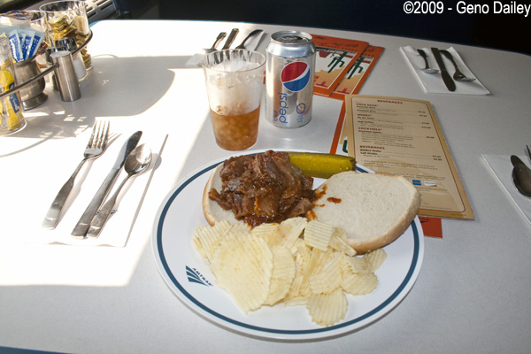 | Taking a lunch break in the dining car. Today's special was the BBQ Beef Brisquet Sandwich, this was excellent!!! |