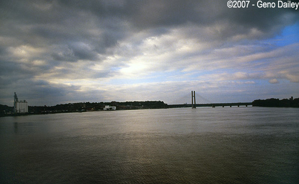 Now riding on the BNSF Ottumwa Sub, we cross the mighty Mississippi River from Illinois into Iowa. The bridge in the background is carrying US 34 into Burlington, IA, which would be the next stop for the train as well. |