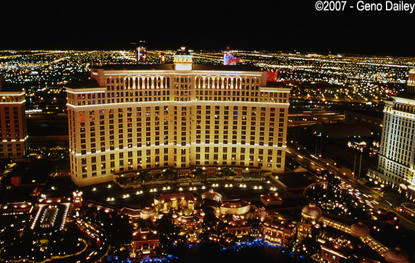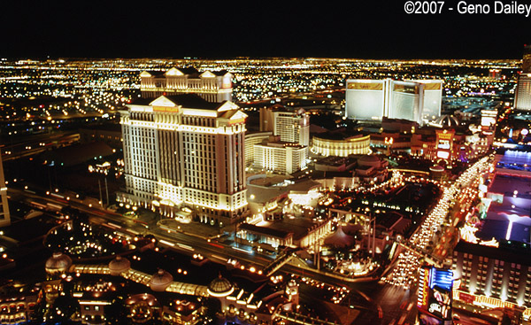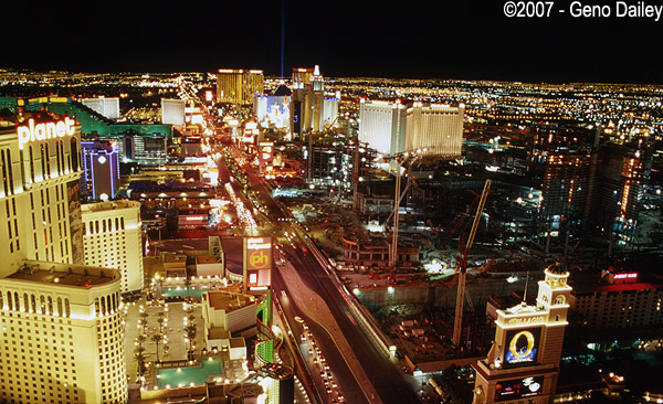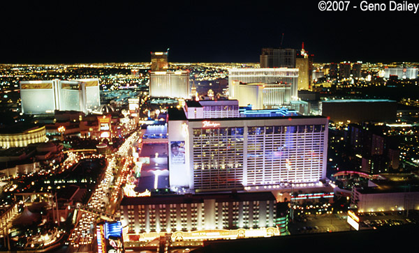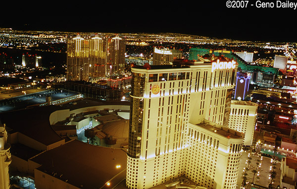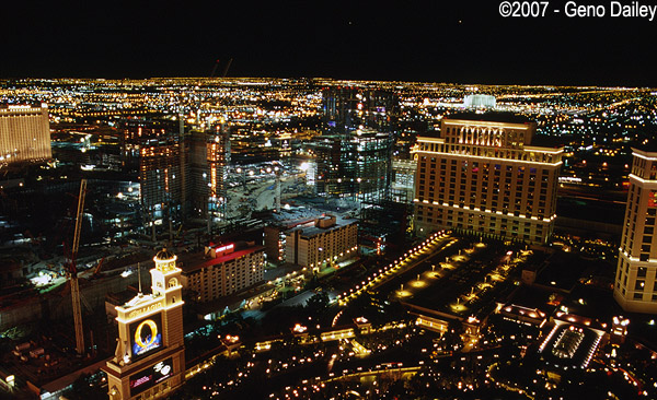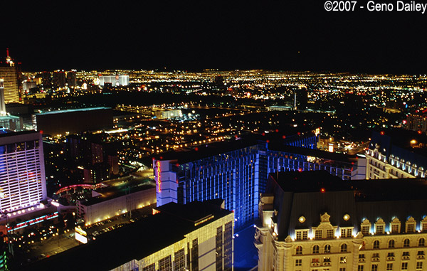 This is one of the best places to see Vegas from above. The Eiffel Tower that you ride in is half the height of the real Eiffel Tower in Paris. The observation deck at the top of the tower features holes in the fencing so as to place a camera for photography, thus you can do night photography generally well without a tripod. I took my Parents to visit this incredible place and the photos seen here were taken at the top of the Eiffel Tower. |