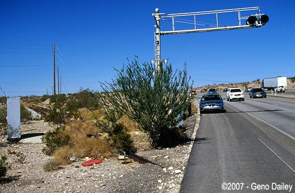 Looking towards Vegas, here's the same rail line again. This line headed towards Hoover Dam and is located near Railroad Pass where another hotel just up the road from here is located that is named after that area. The line was originally built to haul materials to the site of Hoover Dam for its construction in the 1930's. West of here near Vegas, the line serves a pellet plant that receives cars from Union Pacific. East of hear, 3 1/2 miles of this line is owned by the Nevada State Railroad Museum and is used for excursion runs. That beige Pontiac parked on the side of the road was my rental car in Vegas this year. Special thanks once again to Trainorders.com for the info on this line.