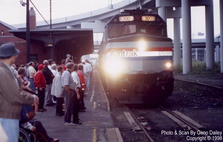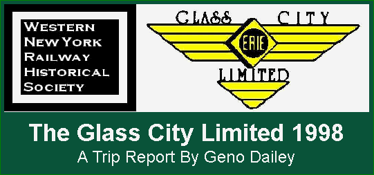On the morning of Saturday, September 26th, 1998, about 400 people gathered at the Amtrak Station on Exchange Street in Downtown Buffalo for one of the best rail excursions of the year, the Glass City Limited. The trip, co-sponsored by Amtrak and the Western New York Railway Historical Society, follows the old Erie Railroad mainline from Buffalo to the famous Glass City of Corning, New York. While in Corning, passengers would have a chance to visit the Corning Glass Works, the Rockwell Museum, as well as the many fine shops along Market Street. This year’s train consisted of 2 F40PH’s #300, and 280 respectively, pulling a 9 car train that contained an Amdinette, 4 Amfleet I Coaches, 1 Heritage Fleet Coach, 3 Connecticut DOT Commuter Cars, and private car, “Dagny Taggart” owned by the West Texas and Buffalo Steamship and Railway Company. The train traveled along historic former Erie Railroad trackage Southeast on what is now known as the Conrail Southern Tier Line, passing through many small towns and villages as well as the famous bridge over the Letchworth Gorge in Portageville, New York. |
