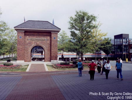 With our train’s nose sneaking through the front entrance to the Corning Glass Works, we see some of our passengers admiring the area where our train parked just after arriving in Corning. Hiding behind our train is the Corning Glass Works World Headquarters which as you can see in the above photo, has been beautifully landscaped and is quite a tourist attraction.