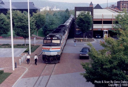 Here is an overhead view of the area where our train was parked in Corning. Located behind the train in the upper left hand corner of the photo is the Corning Glass Works and World Headquarters, the whole building is covered with Glass, appropriately!!! The building next to the train, on the right, is a parking ramp for Corning Employees. Interestingly enough, the area behind the parking ramp has the tracks running through a perfectly landscaped lawn, all you see is the 2 rails, no ballast, no ties, that's all underground.