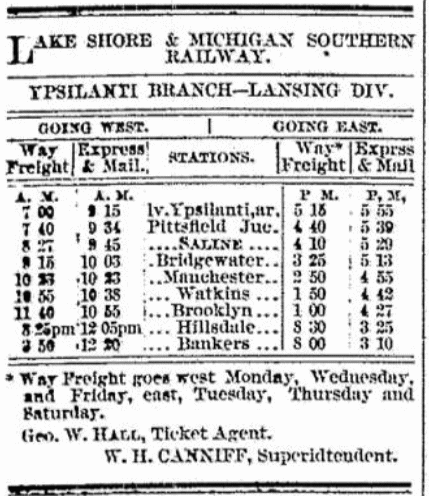 The following very desirable (??) change in time and trains on this branch of L. S. & M. S., very readily convinces all who thought the falling of the D. H. & S. W., into the hands of the L. M. & M/. S., would by so great an advantage, that they are badly “left.” One train each way has been taken off entirely, while the remaining, run as follows; Mail and express, going west 9:45. a. m.; Mail and express going east 5:29, p. m.; freight west Monday, Wednesday, and Fridays at 8:27 a. m.; freight east Tuesday, Thursday, and Saturday, at 4:10 p. m. Trains now run by Columbus time, which is very near local time. By the above it will be seen that if our business men wish to spend a day in Detroit, they will either be obliged to remain there two nights, or drive back and forth between this place and Ypsilanti. Then our freight, it will be so handy(?) to receive it, ever-other day.