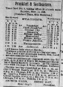 GRAND TRAVERSE HERALD Nov. 18, 1886Work is being done on the Frankfort and Southeastern railroad. Three miles have already been graded and made ready for the ties.