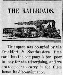 The excursion last Sunday on the F. & S. E. was a decided success – at least financially for the railroad company. Three coaches were completely filled with Sabbath breakers, the most of whom went through to Frankfort, where they wore out lots of shoe leather trying to find something worth looking at.