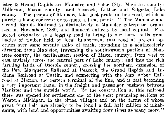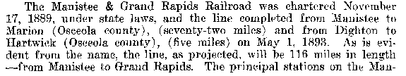 Manistee & Grand Rapids Railroad, chartered Nov. 17, 1889, under the laws of Michigan, projected from Manistee to Grand Rapids, MI, distance 116 miles, with capital stock of $1,000,000.