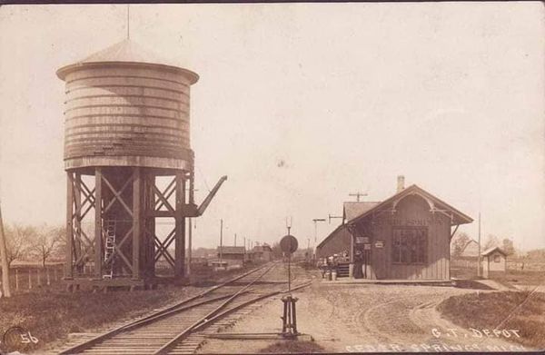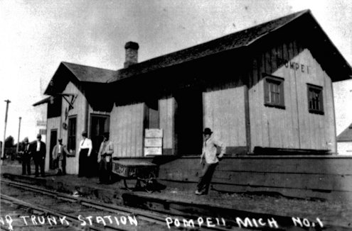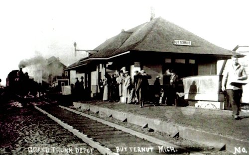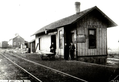 The Grand Trunks' replacement of the Perrinton, Butternut, Sheridan, and Vickeryville depots has always puzzled me. At first I thought they had burned down, buildings used to burn down a lot. But four buildings in that same area in about four years time, an arsonist on the loose? Then I found a photo of Butternut with both depots!