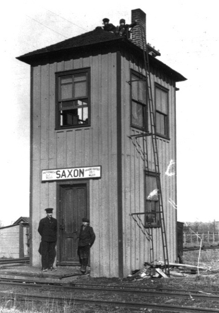 Saxon tower was one of five interlocking towers the TS&M built in 1888. Saxon is the only building that I have a photo of in all three TS&M paint schemes. Saxon served as an interlocker from 1888, protecting the C&WM crossing, until it was replaced with gates on Oct. 5th 1933.