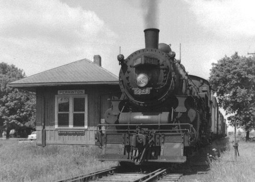 Leaving Ashley at 11 10 am the train passes through Pompei and stops at Perrinton for 10 minutes. Leaving Perrinton at 11:47 am it runs to Middleton where the train crew goes to beans. Leaving Middleton they arrive at Carson City at 12:55 pm. The crew spends the next 40 minutes switching the refinery and grain elevators. The train spends six minutes at Butternut then passes through Vickeryville and on to Sheridan, arriving at 2:10 pm. The next 50 minutes are spent switching the Carnation Milk plant, the lines largest customer. Leaving Sheridan at 3:00 pm the train arrives at Greenville at 3:20 pm with 6 loaded cars. The crew drops the train in the yard, parks the combine on the caboose track, and turns the engine on the wye and turns #2671 over to hostler Keith Varney who coals the engine, drops the ashes, and parks the N-9-d consolidation on the coal track. Mr. Varney is also the coal tender and keeps the 100 ton wooden coaling tower full. He stays in a shack near the tower and keeps the fire tended in the engines that lay-over at Greenville. The crew is released at 4:00 pm, eight hours on duty.