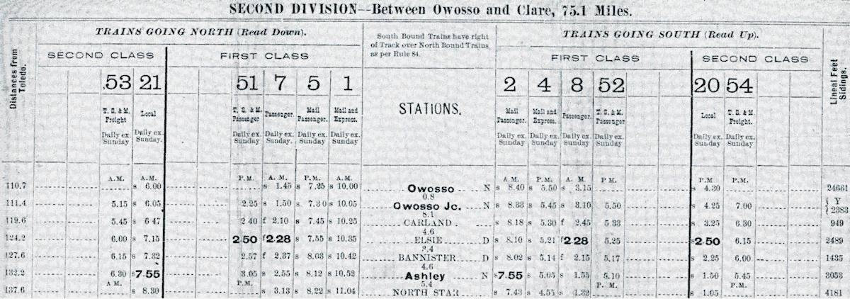 Toledo, Ann Arbor & North Michigan Timetable dated August 21, 1892 lists the Toledo, Saginaw & Muskegon trains as passenger 51, 52, and freight as 53, 54