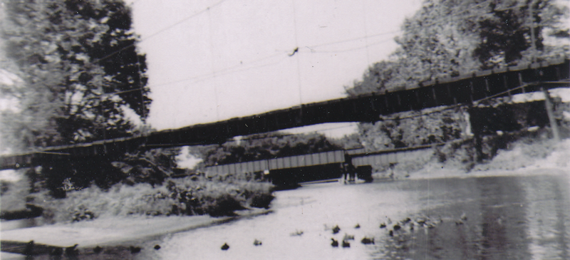 Bridge in Owosso over Shiawasse River in background Footbridge in foreground leading to city water pumping plant |