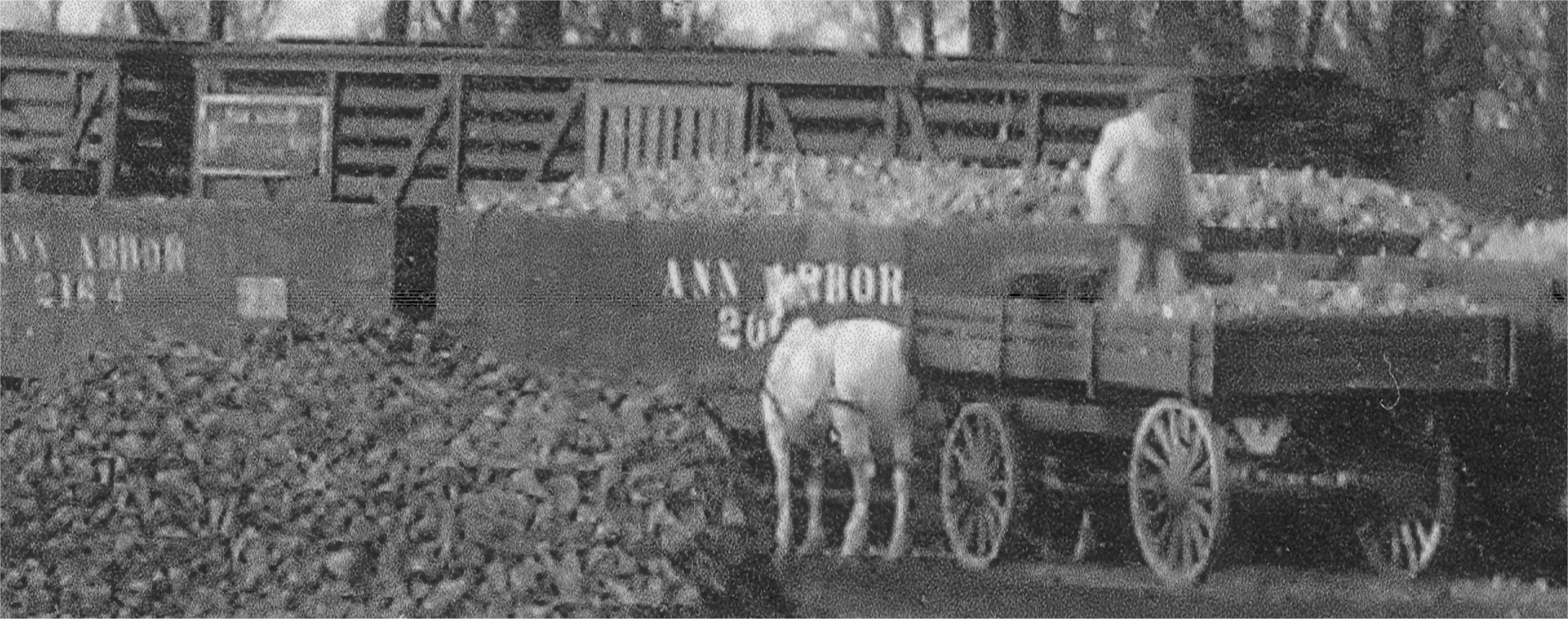 The location is unknown - there is a Ann Arbor stock car with key Herald and two gonolas 20xx and 2144 being loaded with sugar beets, the foreground building is a scale house