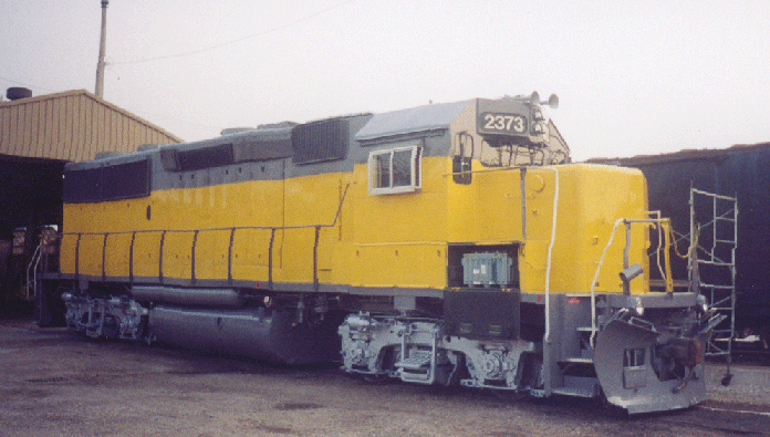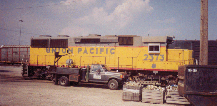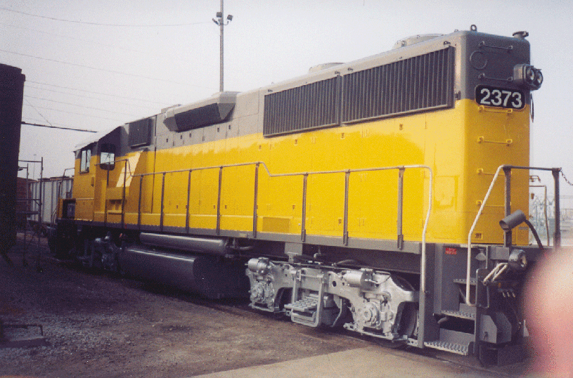 The two new locomotives on the Annie were previously on the UP and before that the MKT. They are both GP 39-2's. I took these pictures in Toledo as the locomotives were prepared for work. #2373 arrived in fresh UP paint, except that the trucks were painted with the same gray paint as the lower part of the body, and that is not the true UP color scheme. Some paint shop got lazy, is my guess, because they knew it would never operate on the UP again at the time of its painting. The second locomotive was in rough shape, paint-wise, and has been repainted in true UP colors. The new logo for the the Annie is underneath the window of the cabs. I asked, and yes it is the new logo.