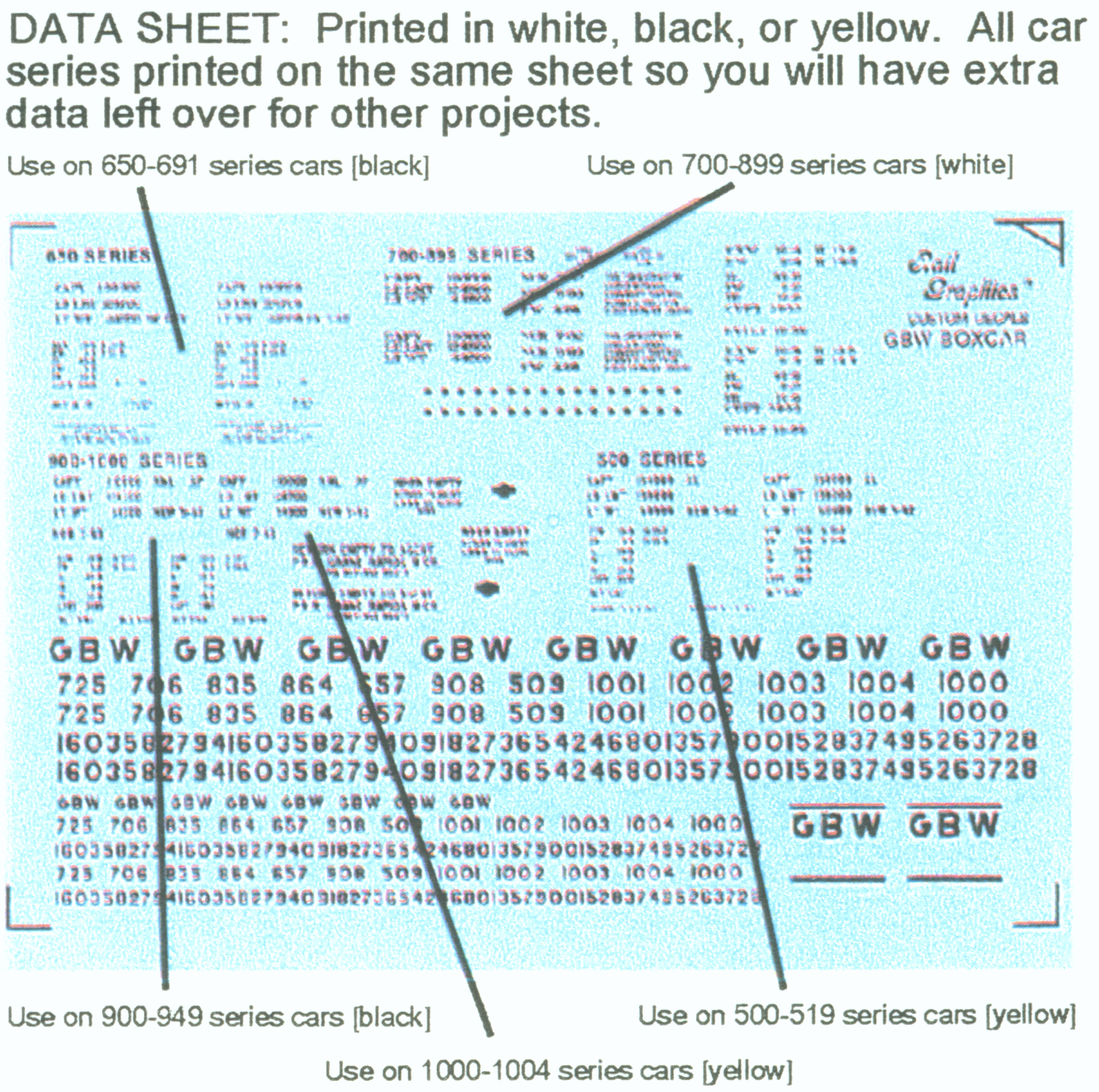 GBW Set 1: Set contains one data sheet, two pairs of 12-inch plus two pairs of 9-inch roadname, and four pairs of heralds. White lettering for boxcar red and bright red cars.