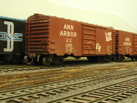 AA 1407, one of the XML PS-1 boxcars in the series 1400-1409. The 1407 is the one to have the large pennant as far as I know. Intermountain kit, painted and lettered mostly with C-D-S dry transfer. |