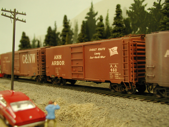 AA 460, another 400-series PS-1 boxcat from an Intermountain kit (painted with C-D-S lettering). This is not the orginal paint scheme (the basis of the model was an Emergy Gulash photo in the Morning Sun book "GN Color Guide to Freight and Passenger Equipment." In the background is a photo of a GB auto rack is AA 460 in this paint scheme). |